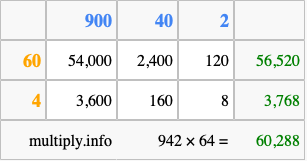 That's all there is to it! As you can see from the box above, the answer to 942 times 64 using the box method is 60,288.