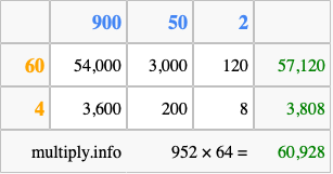 Below is an illustration showing you how to calculate 952 times 64 using the box method, using the instructions above.