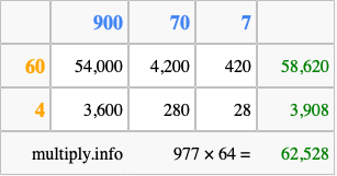 That's all there is to it! As you can see from the box above, the answer to 977 times 64 using the box method is 62,528.