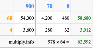 That's all there is to it! As you can see from the box above, the answer to 978 times 64 using the box method is 62,592.