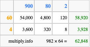 Finally, we add up all the sums we found in step 3 to get our final answer to 982 times 64.
