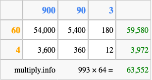 That's all there is to it! As you can see from the box above, the answer to 993 times 64 using the box method is 63,552.
