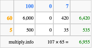 Finally, we add up all the sums we found in step 3 to get our final answer to 107 times 65.