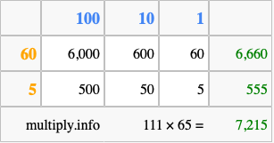 That's all there is to it! As you can see from the box above, the answer to 111 times 65 using the box method is 7,215.