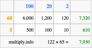 Below is an illustration showing you how to calculate 122 times 65 using the box method, using the instructions above.