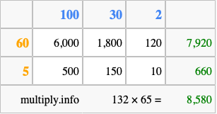 That's all there is to it! As you can see from the box above, the answer to 132 times 65 using the box method is 8,580.