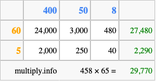 Finally, we add up all the sums we found in step 3 to get our final answer to 458 times 65.