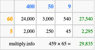 That's all there is to it! As you can see from the box above, the answer to 459 times 65 using the box method is 29,835.