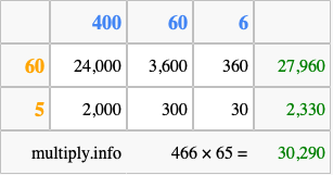 Finally, we add up all the sums we found in step 3 to get our final answer to 466 times 65.