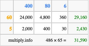Finally, we add up all the sums we found in step 3 to get our final answer to 486 times 65.
