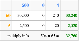 Finally, we add up all the sums we found in step 3 to get our final answer to 504 times 65.