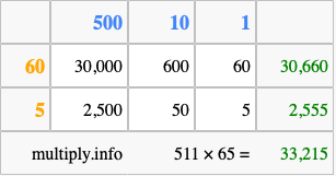 Below is an illustration showing you how to calculate 511 times 65 using the box method, using the instructions above.