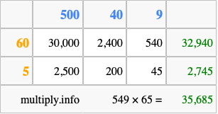 Below is an illustration showing you how to calculate 549 times 65 using the box method, using the instructions above.