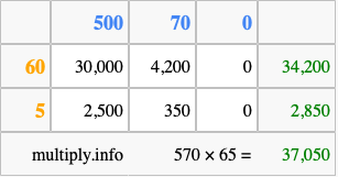 Finally, we add up all the sums we found in step 3 to get our final answer to 570 times 65.