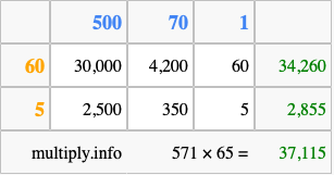 Below is an illustration showing you how to calculate 571 times 65 using the box method, using the instructions above.