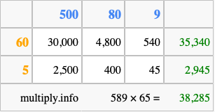 Below is an illustration showing you how to calculate 589 times 65 using the box method, using the instructions above.