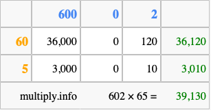Finally, we add up all the sums we found in step 3 to get our final answer to 602 times 65.