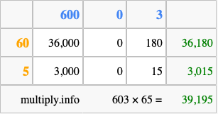 Below is an illustration showing you how to calculate 603 times 65 using the box method, using the instructions above.