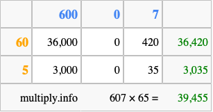 Below is an illustration showing you how to calculate 607 times 65 using the box method, using the instructions above.