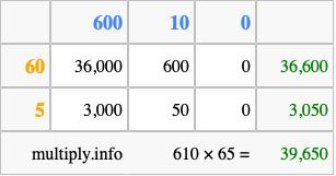 Below is an illustration showing you how to calculate 610 times 65 using the box method, using the instructions above.