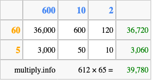 Below is an illustration showing you how to calculate 612 times 65 using the box method, using the instructions above.