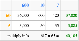 Below is an illustration showing you how to calculate 617 times 65 using the box method, using the instructions above.