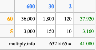 Below is an illustration showing you how to calculate 632 times 65 using the box method, using the instructions above.