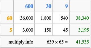 Finally, we add up all the sums we found in step 3 to get our final answer to 639 times 65.