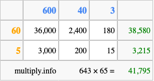 That's all there is to it! As you can see from the box above, the answer to 643 times 65 using the box method is 41,795.
