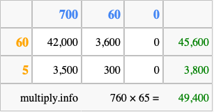Finally, we add up all the sums we found in step 3 to get our final answer to 760 times 65.