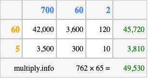 Below is an illustration showing you how to calculate 762 times 65 using the box method, using the instructions above.