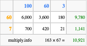 That's all there is to it! As you can see from the box above, the answer to 163 times 67 using the box method is 10,921.