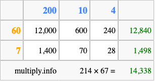 Finally, we add up all the sums we found in step 3 to get our final answer to 214 times 67.