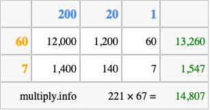 Below is an illustration showing you how to calculate 221 times 67 using the box method, using the instructions above.