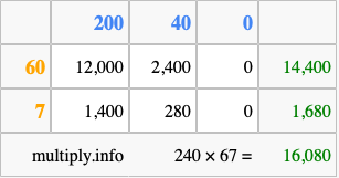 Finally, we add up all the sums we found in step 3 to get our final answer to 240 times 67.