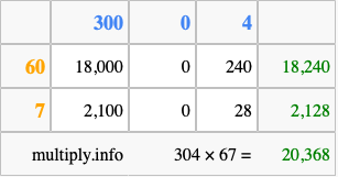 Finally, we add up all the sums we found in step 3 to get our final answer to 304 times 67.