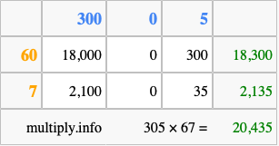 Below is an illustration showing you how to calculate 305 times 67 using the box method, using the instructions above.