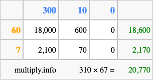 Below is an illustration showing you how to calculate 310 times 67 using the box method, using the instructions above.