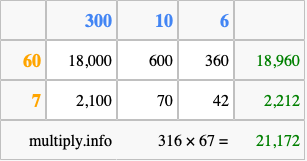 Finally, we add up all the sums we found in step 3 to get our final answer to 316 times 67.