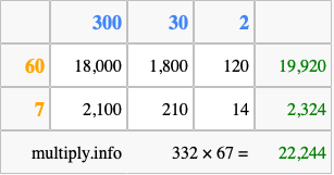 That's all there is to it! As you can see from the box above, the answer to 332 times 67 using the box method is 22,244.