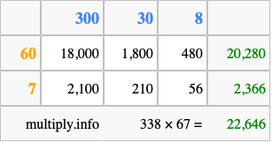 That's all there is to it! As you can see from the box above, the answer to 338 times 67 using the box method is 22,646.