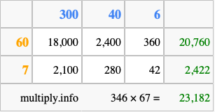 Finally, we add up all the sums we found in step 3 to get our final answer to 346 times 67.