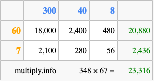 Finally, we add up all the sums we found in step 3 to get our final answer to 348 times 67.