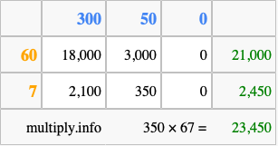 Finally, we add up all the sums we found in step 3 to get our final answer to 350 times 67.