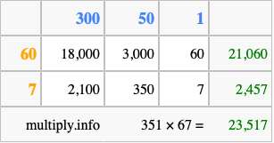 Finally, we add up all the sums we found in step 3 to get our final answer to 351 times 67.