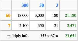 Finally, we add up all the sums we found in step 3 to get our final answer to 353 times 67.