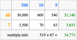 Below is an illustration showing you how to calculate 519 times 67 using the box method, using the instructions above.