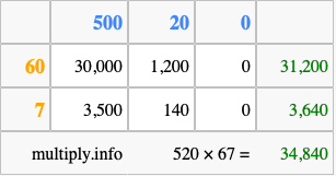 Finally, we add up all the sums we found in step 3 to get our final answer to 520 times 67.