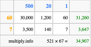 Finally, we add up all the sums we found in step 3 to get our final answer to 521 times 67.