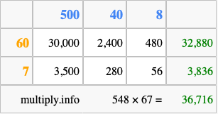 Finally, we add up all the sums we found in step 3 to get our final answer to 548 times 67.